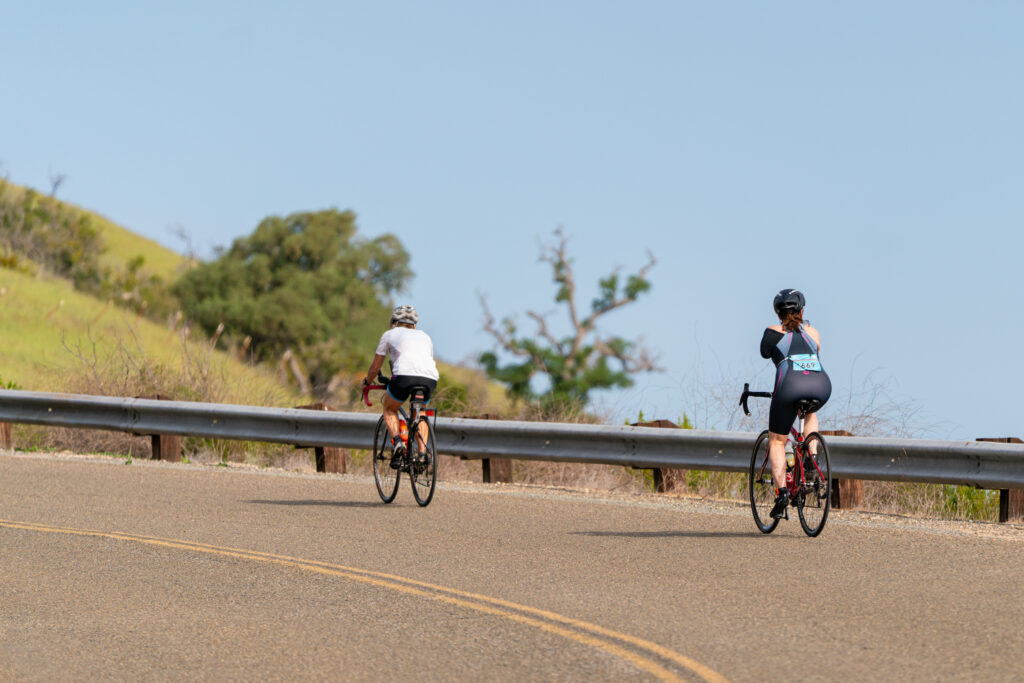 The On Road Sprint Triathlon is a challenging experience for the novice or short distance triathlete. The swim is a 500 meter counter clockwise swim. The bike course goes up Lynch Hill and out San Antonio Drive and Interlake Road to the turn-around at 10K. The hills are rolling and county roads are scenic. You then head back on the same course back down Lynch Hill and to the transition area. The run is a 5K run along the lake and past “Beach City” where the Cal Poly volunteers stay at night. Like all the Wildflower courses this one is tough, but satisfying when you finish. Just being part of the Wildflower Experience is worth every extra heartbeat.